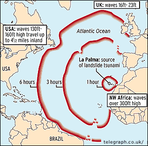 “A wave higher than Nelson’s Column and travelling faster than a jet aircraft will devastate the eastern seaboard of America and inundate much of southern Britain, say scientists who have analyzed the effects of a future volcanic eruption in the Canary Islands.