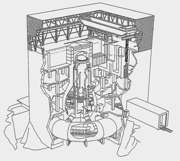 The actual "pressure suppression system" structures credited for containment sit below this structure inside the concrete reactor building, namely the drywell and wetwell or "torus." The drywell is the large inverted lightbulb steel structure which is 100 feet tall and a nominal wall thickness of 1.5 inches. The reactor vessel sits inside this structure. In the event of a coremelt accident involving high pressure and high temperature, the highly radioactive steam and pressure would be vented into the drywell and then routed through the large diameter pipes to the "wet well" or "torus" which is the large 18 foot diameter hollow doughnut-shaped structure that surrounds the drywell. The torus contains approximately 1 million gallons of water and designed to receive the pressurized radioactive steam where it is supposed to be quenched and contained.