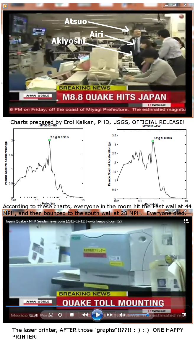 Meet Atsuo, Airi, and Akiyoshi. They were all the best and most dedicated people at the NHK newsroom, in Sendai Japan. Akiyoshi loved Airi, and Atsuo was the one who introduced them. Unfortunately, all 3 died in the quake. Akiyoshi got a severe cut and bled to death when he hit a display screen behind him at 44 miles an hour, and was then thrown out through a hole in a collapsed wall. Airi followed pretty much the same path, and died beside him in the rubble. Atsuo flew through the open door behind him, then crashed through a window and was crushed when he landed in a massive seismic crack in the road, which closed in on him. Others in the newsroom died also, but I never thought up names for them. At least, according to the official USGS charts. The laser printer was never found, but the table it was on ended up on top of the rubble, smashed to pieces, where one of the few survivors used a piece of the metal frame to splint his broken leg.