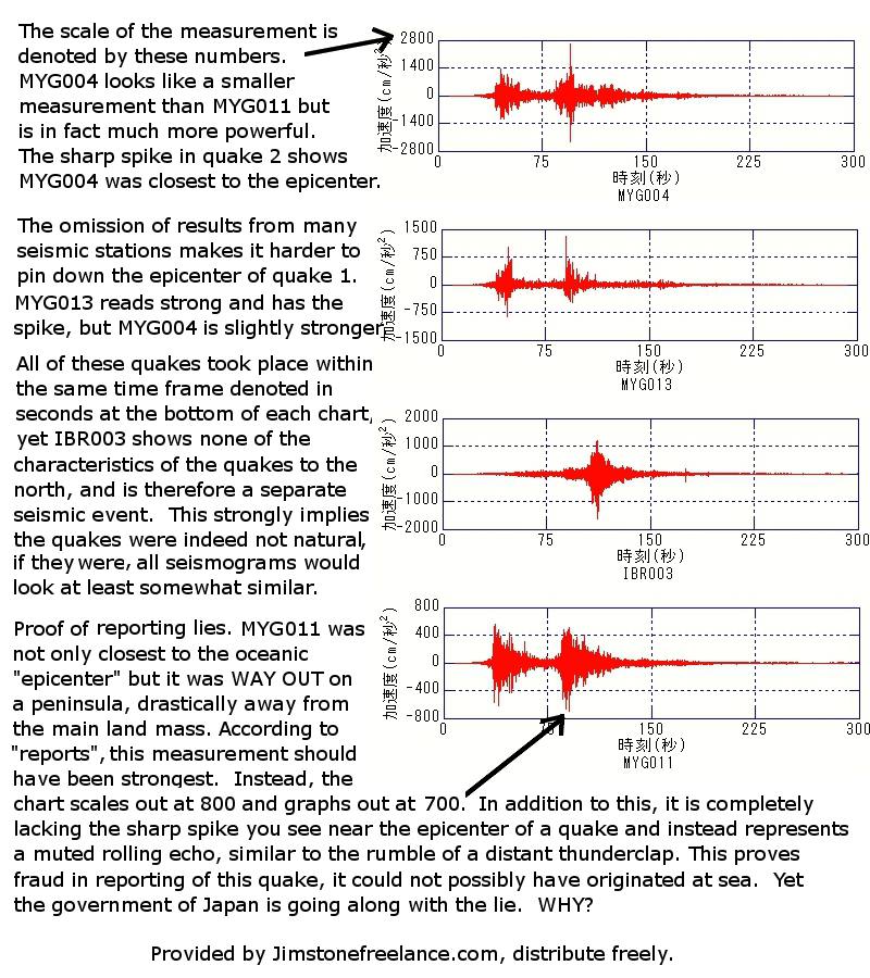 1. I got the real seismic data that proves beyond a doubt the quake is not what we were told and was in fact an inland 6.8, (calculated higher than the seismogram due to the triangulated true epicenter being a little higher) which would get noticed but not feared in quake ridden Japan.