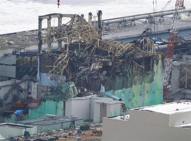 The three images above are all of structure number 4, the ruin containing one of the 7 damaged cooling pool holding over 4,000 tons of highly radioactive spent nuclear fuel rods at Fukushima #1. This hulk of a structure is not expected to survive another significant earthquake. If the shock of another earthquake results in the spilling of this already-decimated structure’s radioactive cargo into the open air, it is predicted by a number of experts in the field that a radioactive bonfire will ensue that will be the slow-motion equivalent of a major nuclear war. Notice the large round bright yellow structure that appears in all four photographs, including the first one taken of the cooling pool above reactor number 4 before 3/3/11. Consider the obvious design stupidity that situates the cooling pool for spent nuclear fuel rods 100 feet in the air.