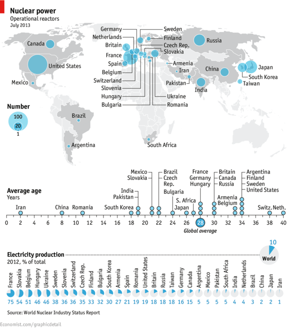 The [nuclear] industry's role in electricity production is continuing to decline, according to this year's World Nuclear Industry Status Report [13], a compendium of analysis and data by the activist and expert Mycle Schneider. The number of reactors peaked in 2002 at 444, compared with 427 today. The share of electricity they produce is down 12% from its 2006 peak, largely because of post-Fukushima shutdowns in Japan. As a proportion of all electricity generated, nuclear peaked in 1993 at 17% and has now fallen to 10%. The average age of operating plants is increasing, with the number over 40 years old (currently 31 plants) set to grow quite rapidly.