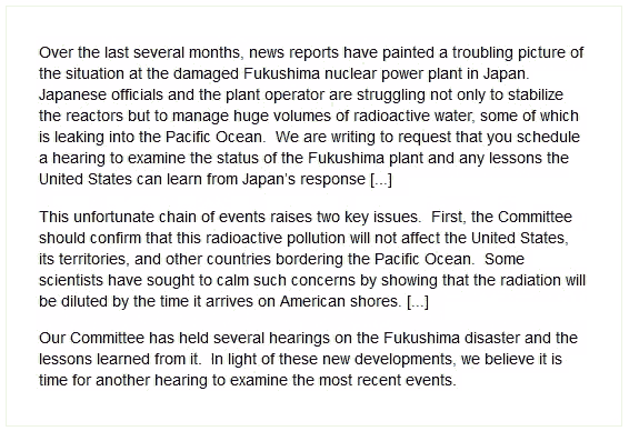 Exclusive: Congressmen request hearing on new developments at Fukushima plant — Key issue is whether radioactive pollution in Pacific Ocean will affect U.S