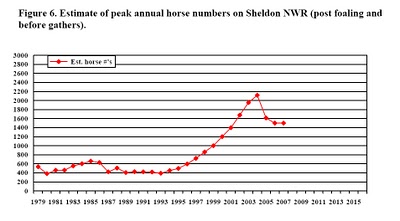 A population graph provided by Sheldon officials reports horse populations were kept relatively stable between 1979 and 1996 but due to funding limitations, removals stopped and managers claimed populations exploded from 600 to 2,200 in just eight years when 772 horses and 99 burros were finally removed in 2004.