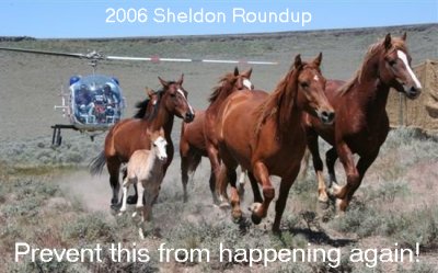 In June of 2006 the Sheldon NWR ordered a gather of wild horses. They had their specially screened contractors ready to take horses and the contractors would receive $300.00 a head for each horse they removed from the gather. The public was assured that gathers are safe and not done during foaling season. Yet extreme measures were taken to attempt to hide all activity from the public. Police were hired, gates were installed and a two-mile distance was then established for the public. Cattoor the company that flies the helicopters took to the air. I will add more info about the Cattoor contract later.
