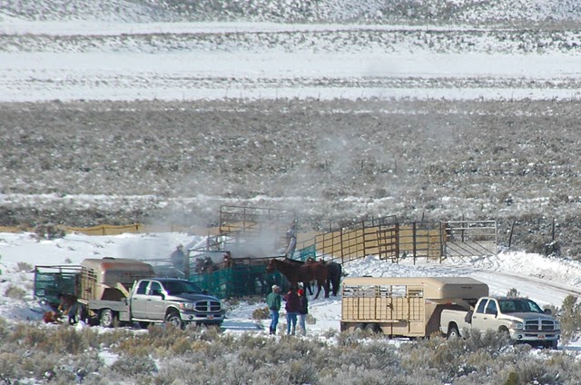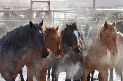 What we see in the top photo, which I've taken the liberty to zoom in on here, are beautiful horses sweating profusely in below-freezing temperatures. You can see the sweat starting to freeze. This situation -- heavy sweat in freezing temperatures -- often results in very sick horses if the horse is not cooled down properly. This was the Calico roundup 2010. It was below freezing.