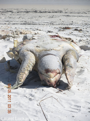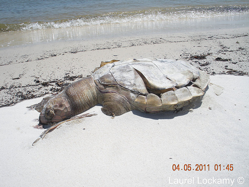 Earlier this week, Laurel went out to the Gulfport beach with her camera to see if any new turtles had washed in. First she saw a dead armadillo curled up in the sand, along with several other dead birds. But a short stroll later she came across another turtle, decomposing along the water’s edge.