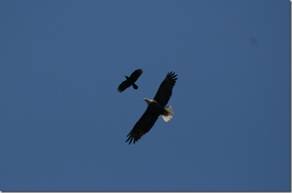 This aerial battle was better than any air show I've been to, including the War Birds show at Oshkosh. The two eagles ripped the crows apart, and ate them on the ground; and, as I got closer and closer working my way across the field, I passed within 20 feet of one of them as it ate its catch. It stopped and looked at me as I went by, and you could see in the look of that bird that it knew who's Boss of the Sky. What a beautiful bird!