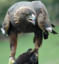 His story: I went out to plant corn for a bit, to finish a field before tomorrow morning and witnessed The Great Battle. A golden eagle -- big, with about a six-foot wingspan - - flew right in front of the tractor. It was being chased by three crows that were continually dive bombing it and pecking at it. The crows do this because the eagles rob their nests.