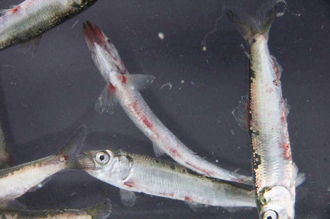 Using a seine net, she dragged up several hundred of the fish this past weekend and found the apparent infection had spread —instead of their usual silver colour the fish had eyes, tails, underbellies, gills and faces plastered with the sickly red colour.