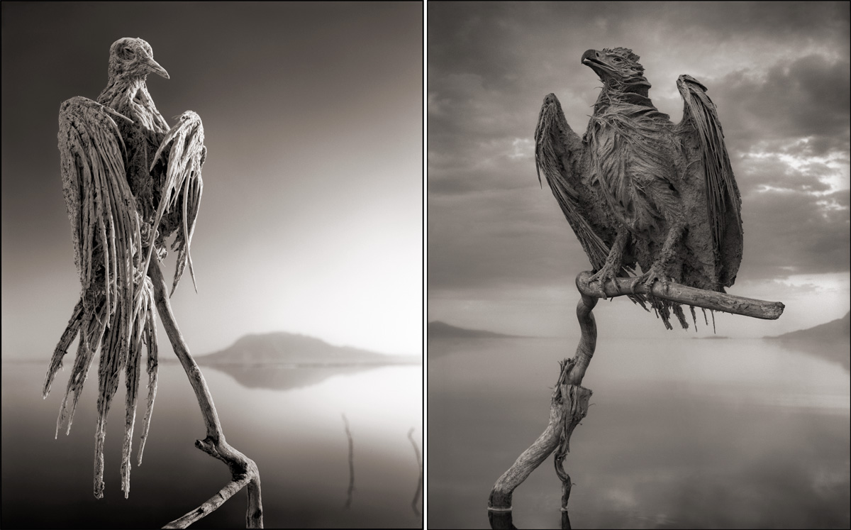 When salt islands form in the lake, lesser flamingos take the opportunity to nest – but it is a risky business, as this calcified bird (top) illustrates. The animals are all arranged in poses by the photographer. Above, on the right we have a sea eagle and on the left a dove, in what is surely the most horrific depiction of the “bird of peace” since Picasso’s Guernica.