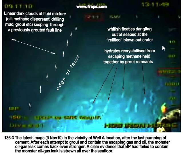 Answer: “In the attempt to seal the oil from oozing through the faults, BP resorted to high pressure grouting. Basically it is like cementing the cracks in the rock by injecting grout (cement mixture) at high pressure. The way they do this is by drilling an injection hole into the shallow rocks and pumping in the grout. The grout in “slurry” state will permeate into the cracks, cure and seal up the cracks. However it is not working because of the presence of gas and oil. It is like super-glue. You need to clean the surfaces before you apply the glue; otherwise it won’t stick and will come off eventually after a few days or weeks. That is why we can see a few blown out craters – shown in my article – Is the last rite for the Macondo Well for real?” (Per BK Lim, Geohazards Specialist)