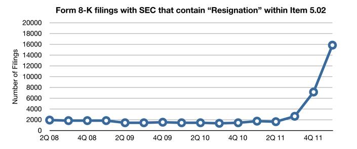 Then I had an idea. The Securities Exchange Act of 1934 requires that publicly traded companies must report to the SEC whenever a member of the Board or certain officers resign. Also, the SEC has a database named EDGAR that is open to the public. After a little research, I discovered that corporations must report said resignations on Form 8-K, Item 5.02. From there, it was a simple matter of searching only Form 8-Ks within a specific range of dates, and including the boolean search terms "Resigns" and "Resignation".