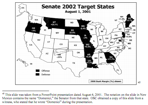 Looking at inappropriate use of government facilities on government time, the report states " The evidence shows that nearly all of the 75 political briefings of which OSC is aware were presented in conference rooms and auditoriums at federal agencies as well as at the EEOB."