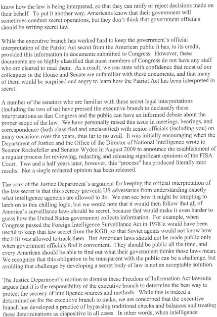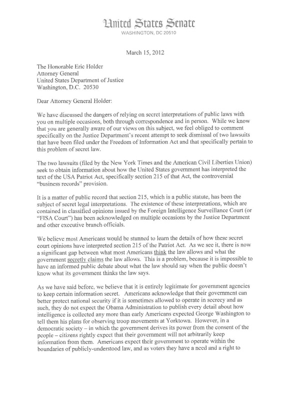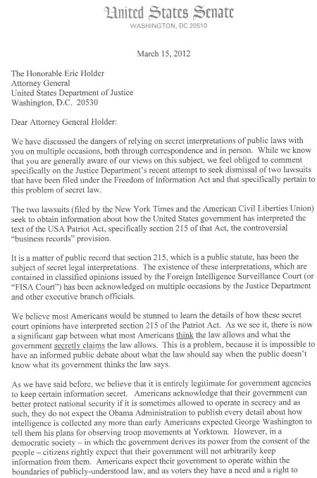 “A number of the Senators who are familiar with these secret legal interpretations (including the two of us) have pressed the executive branch to declassify these interpretations so that Congress and the public can have an informed debate about the proper scope of the law. We have personally raised this issue in meetings, hearings and correspondence (both classified and unclassified) with senior officials (including you) on many occasions over the years, thus far to no avail. It was initially encouraging when the Department of Justice and the Office of the Director of the National Intelligence wrote to Senator Rockefeller and Senator Wyden in August 2009 to announce the establishment of a regular process for reviewing, redacting and releasing significant opinions of the FISA Court (Foreign Intelligence Surveillance Court). Two and a half years later however, this “process” has produced literally zero results. Not a single redacted opinion has been released.”
