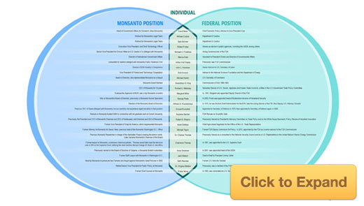 Bills like these are essentially bought and paid for through the millions of dollars Monsanto and other biotech companies spend lobbying the U.S. government each year. In the first quarter of 2011 alone, Monsanto spent $1.4 million on lobbying the federal government -- a drop from a year earlier, when they spent $2.5 million during the same quarter. Monsanto is a perfect example of the revolving door between industry, political offices, and various regulatory agencies. There can no longer be any doubt that Monsanto's success is largely due to the fact that an ever growing list of former Monsanto employees are now in positions of power within the federal government.