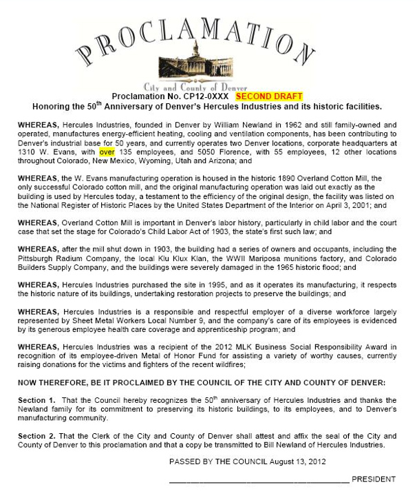 The draft of the document notes that Hercules, which produces energy-efficient heating, cooling and ventilation components, not only runs two locations in Denver, but another 12 in other parts of the of the region, including New Mexico, Wyoming, Utah and Arizona.