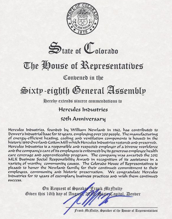The state honor says: “The Colorado House of Representatives is pleased to honor the Newland family for their continued commitment to their employees, community and historic preservation. We congratulate Hercules Industries for 50 years of exemplary business practices and wish them continued success.”