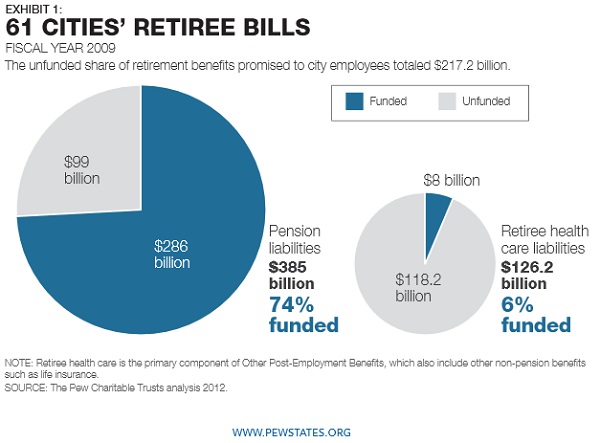 Early this year, the Pew Center released a survey showing that 61 of the nation's largest cities -- limiting the survey to the largest city in each state and all other cities with more than 500,000 people -- had a gap of more than $217 billion in unfunded pension and health care liabilities. While cities had long promised health care, life insurance and other benefits to retirees, "few ... started saving to cover the long-term costs," the report said.