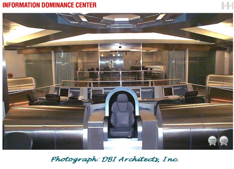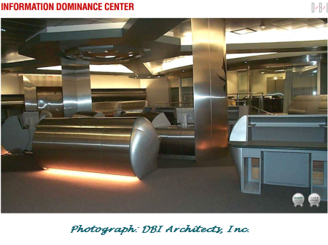 But now, on the website of DBI Architects, Inc. of Washington and Reston, Virginia, there are what purports to be photographs of the actual Star-Trek-like headquarters commissioned by Gen. Alexander that so impressed his Congressional overseers. It's a 10,740 square foot labyrinth in Fort Belvoir, Virginia. The brochure touts how "the prominently positioned chair provides the commanding officer an uninterrupted field of vision to a 22'-0" wide projection screen":
