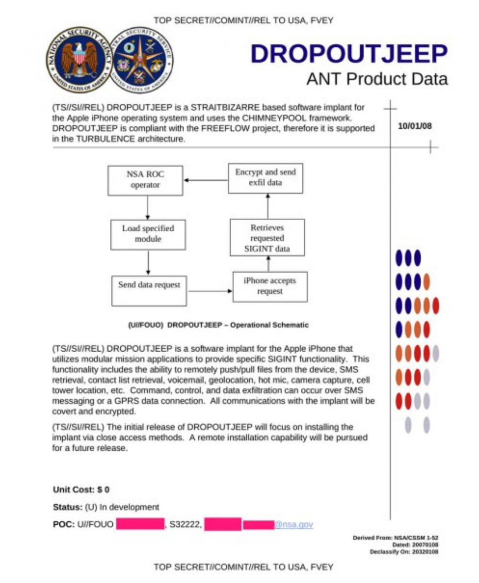 A report from Der Spiegel over the weekend highlighted the NSA's elite TAO hacking unit, which directly targets corporate networks and can even place spyware on devices while they're being shipped to recipients. And yesterday, security researcher Jacob Applebaum and Der Spiegel blew the lid off another NSA program, dubbed "DROPOUTJEEP," which gives the agency fully control of Apple's iPhone.