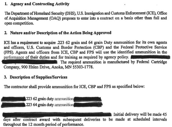 Despite the fact that documents are only supposed to be redacted if authorized by Congress or for national security reasons, a solicitation posted on the FedBizOpps website yesterday concerning ammunition purchases made by the DHS on behalf of Immigration & Customs Enforcement (ICE) contains numerous blacked out sections.