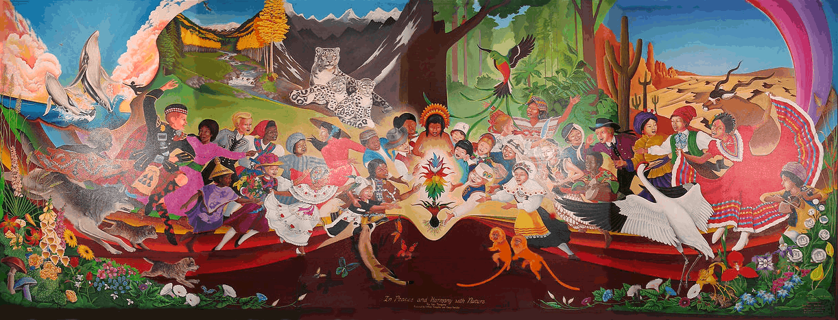 A haloed or headdressed, Latin American Christ figure, possibly Mayan, probably male, adorns the exact center of the Mural. He sits before a colorful, glowing plant, palms suspended over the aura, like someone divining a crystal ball or warming his hands over a fire. It has been pointed-out by experts that the plant is not recognizable as existing anywhere among the earth's flora. Various animals and the children of the nations of the world excitedly and ecstatically approach from all directions, many described as floating in air.