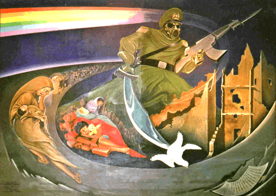 The central focus of the Fourth Mural (the right side of the Second Diptych) is the menacing military figure looming over the destroyed surrounding cityscape amid death and misery of children, grieving mothers, and large-scale relocation of the Masses.