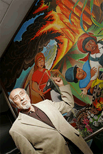 Standing before one of the murals, he says he doesn't understand all the criticism and controversy the murals have generated. He should have looked over his left shoulder at the three coffined women who are just out of sight in the photograph of the second Mural behind him.