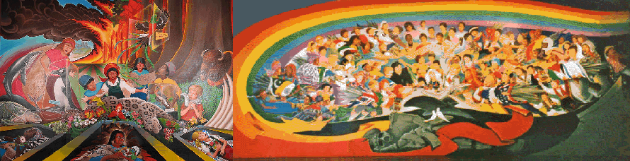 As with the first, Murals 3 and 4 in the second Diptych pose the same controversy over its sequence. Does the horrifying vision of Mural 4 precede the more paradisal scene in Mural 3 or follow it, as we have contended? Everyone sees the military tyrant wreaking havoc before the Mural of the children turning in their swords and achieving peace in the world; first, as with the first two Murals, because this provides a better storyline by showing the victory over political oppression and tyranny; and, second because he is alive in the fourth Mural and appears to be dead in the third.