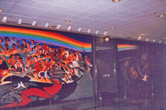 The first Mural depicts plants, animals, children, and nature. In fact this one is actually called "At Peace and Harmony with Nature;" which may sound all right at first, until we recall the First Commandment chiseled in eight languages on the giant slabs of the ominous Georgia Guidestones,