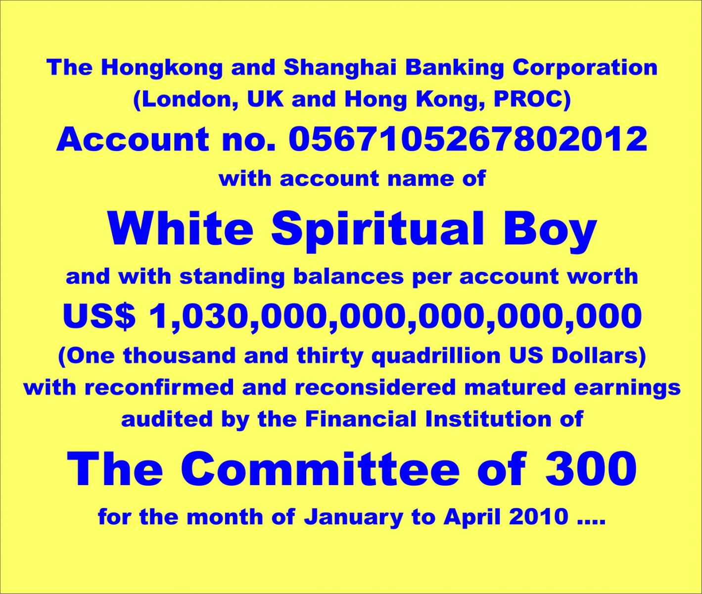 The Committee of 300's shadow government world banking system, conducted across mainstream-media-invisible black and grey screens, is composed of thousands of such accounts, many of them named "White Spiritual Boy". The lead signatory for each of these accounts is Elizabeth Windsor (Queen Elizabeth II of England).
