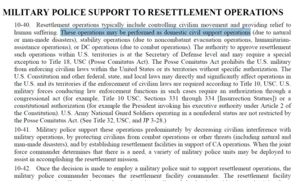 The manual states, “These operations may be performed as domestic civil support operations,” and adds that “The authority to approve resettlement such operations within U.S. territories,” would require a “special exception” to The Posse Comitatus Act, which can be obtained via “the President invoking his executive authority.” The document also makes reference to identifying detainees using their “social security number.”