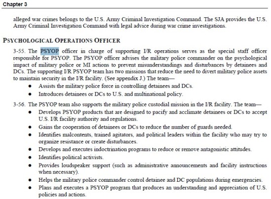 The re-education process is the responsibility of the “Psychological Operations Officer,” whose job it is to design “PSYOP products that are designed to pacify and acclimate detainees or DCs to accept U.S. I/R facility authority and regulations,” according to the document.
