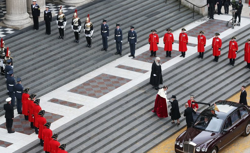 QUEEN OF ENGLAND MEETS THE KING OF THE CITY OF LONDON AT THATCHERS FUNERAL