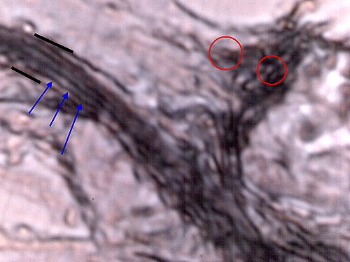 sub-micron interior filament network (blue arrows) and Chlamydia-like organisms(red circles).
