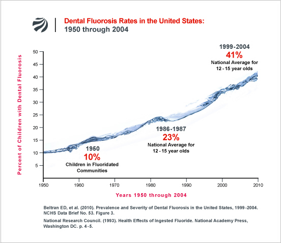 While not all fluoride is bad, the type that has been promoted by dentistry and added to our water and food supply beginning in the 1940s certainly is. Calcium fluoride is a naturally occurring mineral, while its synthetic counterpart, sodium fluoride (silicofluoride), is an industrial-grade hazardous waste material made during the production of fertilizer. Its past history includes patented use as rat poison and insecticide. There are many blind- and double-blind studies that show sodium fluoride has a cumulative effect on the human body leading to allergies, gastrointestinal disorders, bone weakening, cancer, and neurological problems, while actually damaging tooth enamel if consumed in high enough quantities. The chart below illustrates that dental fluorosis rates have only risen over the 60 years since its addition to dental products, food and water.