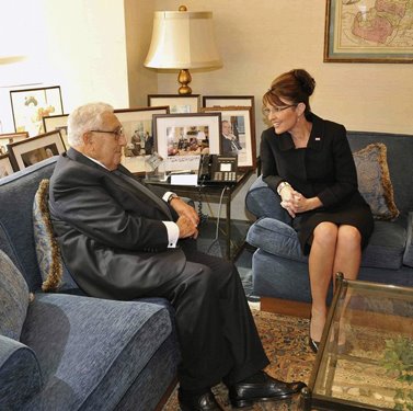Translation:  MK'd  GOP  "doll"  Palin has been programmed to download/upload coded intel, and been summoned by her degenerate globalist master/programmer, Zionist-war criminal, Bohemian Grove member, Rothschild/Rockefeller Syndicate agent Henry Kissinger...who famously stated "power is the ultimate aphrodisiac..."