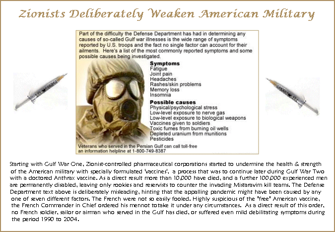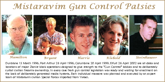 There were also other less academic considerations. At best is was envisaged that up to 250,000 Zionists made up of four and six-man covert “Mistaravim” hunter-killer teams would be inserted into the Americas using various subterfuges, but this was still a very small number when compared with the massive strength of existing armies in North and South America. Even with the element of complete surprise the odds were against success, so supplementary plans were then added to biologically cripple at least fifty-percent of active-service United States military units, and disarm the civilian populations of North and South America, after staging a comprehensive series of high-profile “lone nut” massacres in school yards and elsewhere. More about these plans later.