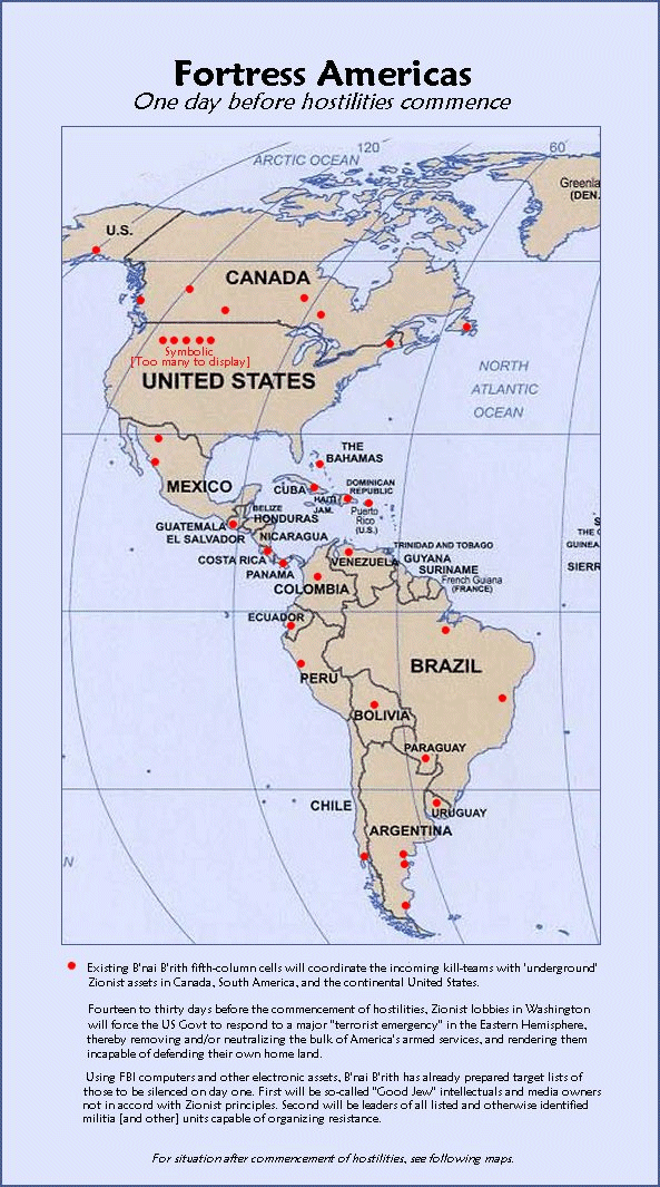 As you will read later in this multi-part Fortress Americas report, some of the first targets of the Zionist hunter-killer teams in North and South America will be prominent Jews, who do not see eye-to-eye with their crazed Zionist brethren, thus rendering them higher priority targets than even the leaders of various hostile American militias. If I was an “anti-Semite’, then no doubt I would lock “Fortress Americas” securely in a cupboard, chuckle insanely, buy a giant bucket of popcorn, and then sit back in Australia waiting for the pre-emptive strikes to start on television.