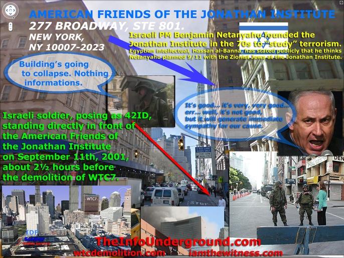 I don't know how the possibility that they were guarding the entrance to the building escaped me, having identified the location, but while researching the possibility that Larry Silverstein may have served as treasurer for the Jonathan Institute (thanks to a post by Real Truther over at WTCDemolition: More Links Between Silverstein and Netanyahu), I instantly recognised the New York address of American Friends of the Jonathan Institute.