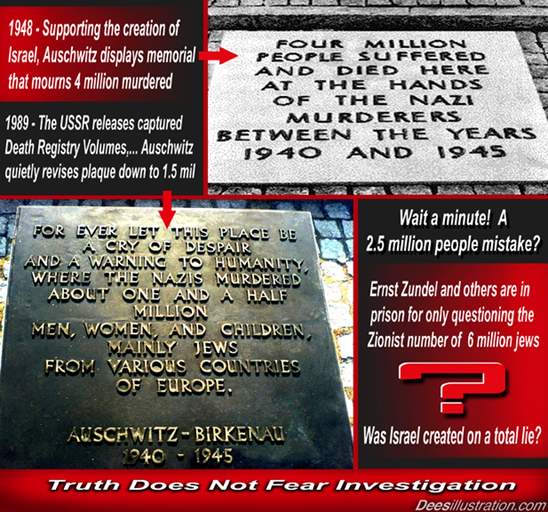 LD: Actually, the official figures for Holocaust victims at Auschwitz were revised downward from 4 million to 1.5 million in 1989. So it was officially admitted at that point that the figure of 2.5 million needed to be subtracted from the 6 million figure. Incredibly, no such subtraction has ever taken place. The magic 6 million figure remains unaltered. And merely to question it is an imprisonable offense in seventeen countries: Austria, Belgium, Canada, Czech Republic, France, Germany, Hungary, Israel, Liechtenstein, Lithuania, Luxembourg, Netherlands, Poland, Portugal, Romania, Slovakia, and Switzerland.