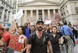 Protesters march past Federal Hall on Wall Street on Monday. The Occupy Wall Street protest is in its second week in New York City as demonstrators speak out against corporate greed and social inequality.
