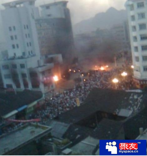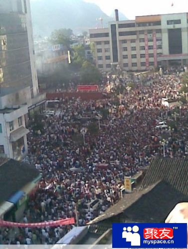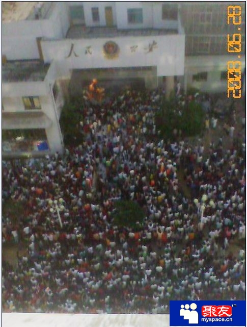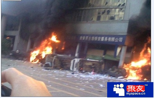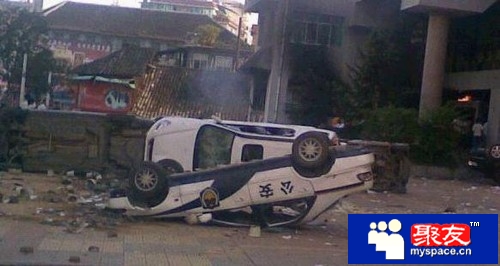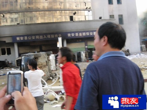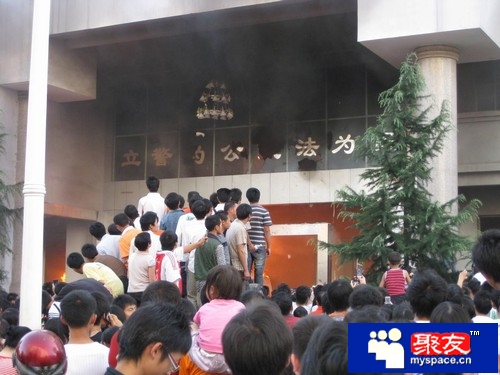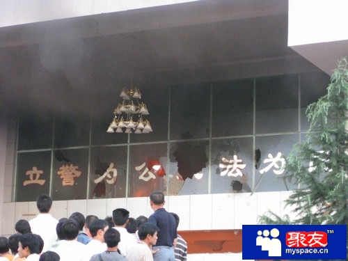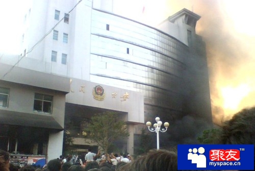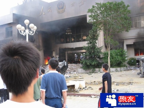 Blogs show unrestBlogs linked to the popular Sina.com Chinese website (www.sina.com.cn) showed pictures of thousands of people surrounding a police headquarters, riot police guarding the burning shell of the building, and burnt and overturned police vehicles.