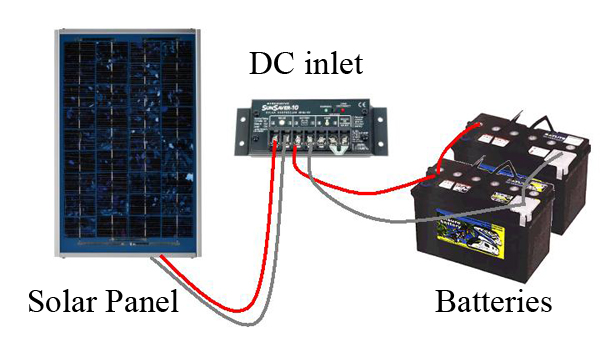 Initial connectionsThis diagram shows how you connect the solar panel to the batteries via the charge controller or DC inlet.