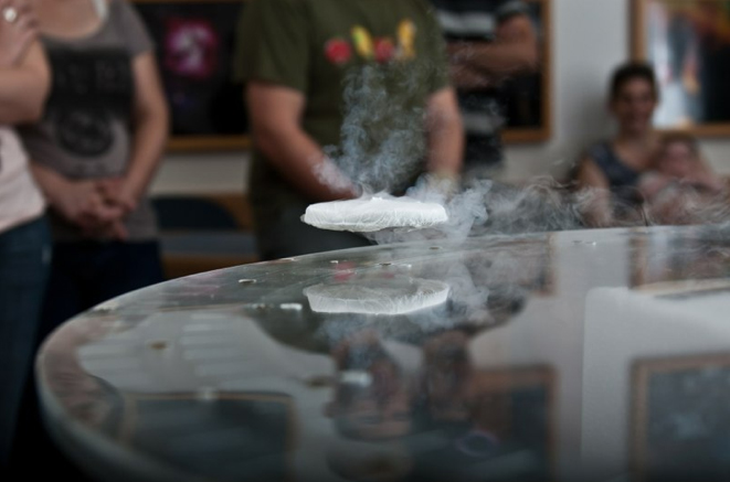 Levitation isn’t just for Houdini anymore. A team of researchers at Tel-Aviv University has discovered a way to make objects float in mid-air using a process called quantum levitation, and they think the tech could even lead to floating alternatives to traditional gas powered vehicles. Their demonstration, which involves using a single sapphire wafer (yes sapphire as in Princess Kate’s ring) coated with a thin later of a material called yttrium barium copper oxide recently wowed the crowds at the recent Association of Science-Technoloy Centers (ASTC) Annual Conference. The liquid nitrogen used to freeze the disc even gives off a cool mist that makes the experiment look all the more exciting.