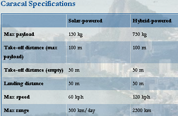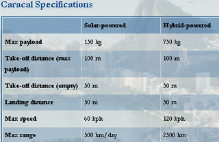 Solar Ship has designed three different concept aircraft, the smallest of which is the Caracal. This design has a claimed payload capacity of up to 750 kg (1,653 lb) for 2,500 km (1,553 miles) with a maximum speed of 120 km/h (75 mph).