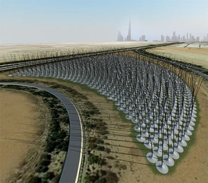In order to be submitted to Masdar city, the project includes 1203 stalks in all, each 180-feet high anchored to the ground with concrete bases 10 to 20 meters in diameter.
