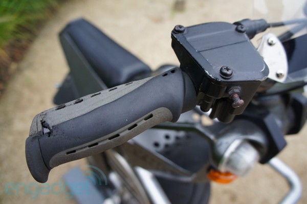 On the right there’s a thumb-throttle and a brake lever, but riding this is more about feel than manual controls. Like a Segway it balances on its own, but with only a single wheel down there it’s up to you to keep it from falling to the left or right. Come to a stop and you need to put at least one foot down, but even at low speeds it’s reasonably well balanced. We never quite toppled over, but that’s thanks at least in part to Chris running behind us the whole time — just in case something went wrong.