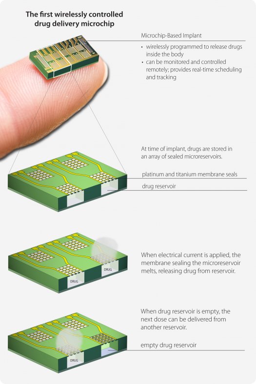 In a new study involving women with osteoporosis, a wirelessly controlled implantable microchip successfully delivered a daily drug regimen, working just as well, if not better, than a daily injection. It could be an elegant solution for countless people on long-term prescription medicines, researchers say. Patients won’t have to remember to take their medicine, and doctors will be able to adjust doses with a simple phone call or computer command.